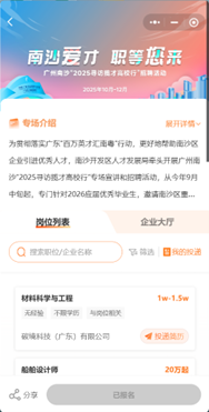 10月至11月,上线“2024—2025年博士后站(基地)日常工作经费资助及在站博士后资助”“2025年博士后建站(基地)工作经费”“南沙区博士后创业资助”政策兑现功能,持续完善博士人才“引育留创”服务保障体系。通过“2025广州南沙‘2025寻访揽才高校行’”专栏发布上百家单位超5600个优质岗位,辅以人才在线简历及企业招聘看板等功能支持,助力进一步降低企业招聘及人才求职成本。完成实习专区功能升级优化,全新整合博士研学实践、365实习计划、百企千人专栏三大核心板块,全方位丰富人才实习实践场景,精准吸引更多博士人才认识南沙、体验南沙、汇聚南沙。